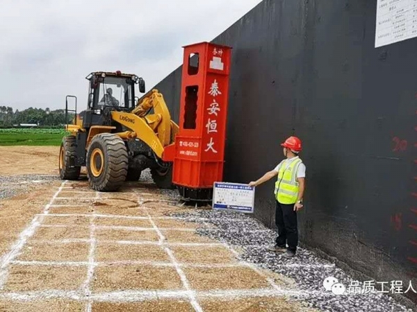 層厚標記采用定制15cm紅白相間的反光貼紙控制層厚,并公示臺背責(zé)任卡,使用高速液壓夯實機進行夯實,提高涵背填筑質(zhì)量。
